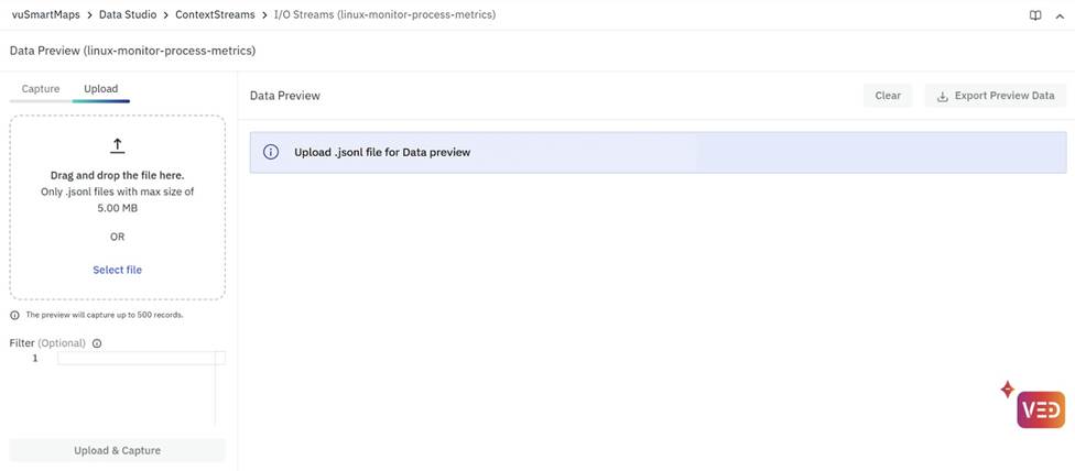 In the 'Upload' tab, users can upload data via a JSONL(JSON Lines) file. After clicking the Upload button, the data preview appears on the right side of the screen. As with the Capture tab, users can export this data using the Export Preview Data button.