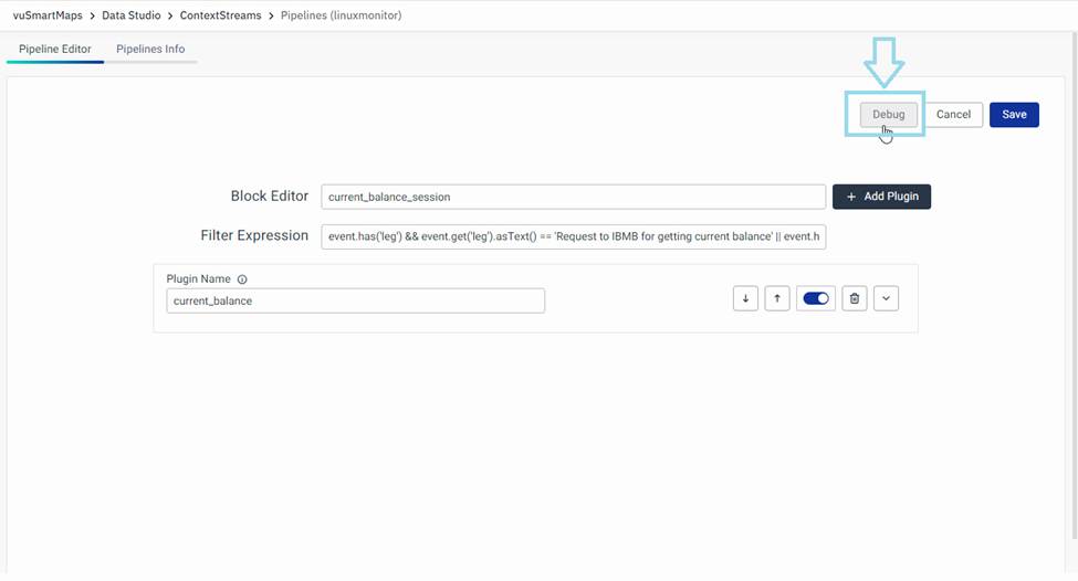 - Click on the Debug button located at the top of the Pipeline Editor page.