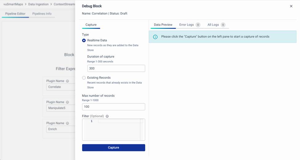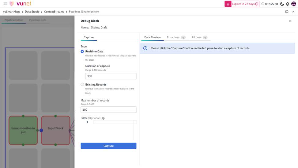 - After providing the necessary details, click on the "Capture" button. During block-level debugging, the system uses input events from the preceding blocks in the pipeline, based on the configured options on the left side of the Debug page. The data is filtered and processed according to the specified parameters, allowing users to evaluate how the selected block processes incoming events. This ensures accurate debugging behavior without impacting live ContextStreams.