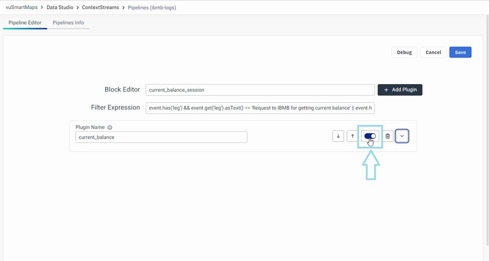 - The Data Preview tab on the right side of the modal will display Input and Output Events. Analyze these fields to ensure that data processing within the block is occurring as expected. If not, make necessary adjustments in the pipeline to ensure proper data contextualization. If there are issues in the output events, you can disable a particular plugin and run the debugs again. Use the radio button to enable/disable the particular plugin.