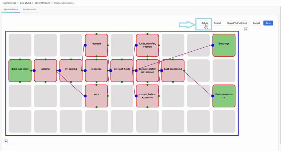 - Head to the pipeline editor page to initiate debugging for the draft version of the pipeline. This allows you to analyze intermediate states, metrics, and data flow specific to the draft version. It aids in identifying and addressing potential problems early in the development process.