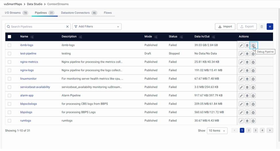 - Navigate to the Pipelines listing page, where you can debug the published version of the data pipeline. This provides insights into the real-time data flow, metrics, and logs, enabling you to identify and address issues affecting the live production environment.