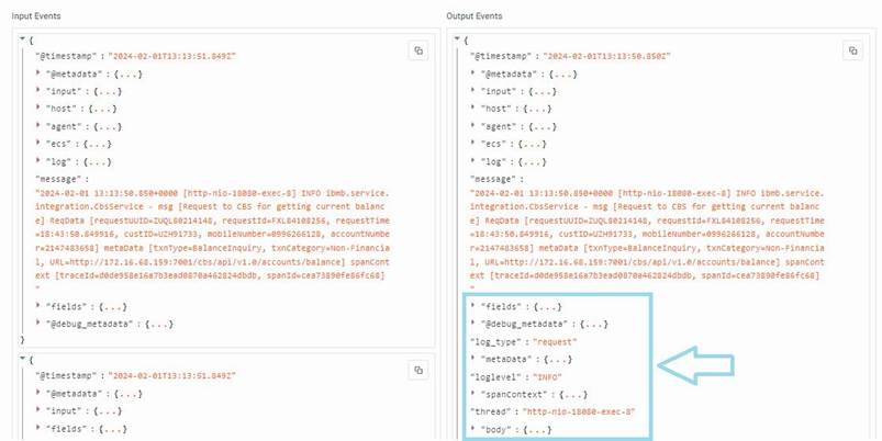 - The Data Preview tab on the right side of the page will display Input and Output Events. Analyze these fields to ensure that data processing is occurring as expected. If not, make necessary adjustments to the pipeline for proper data contextualization.