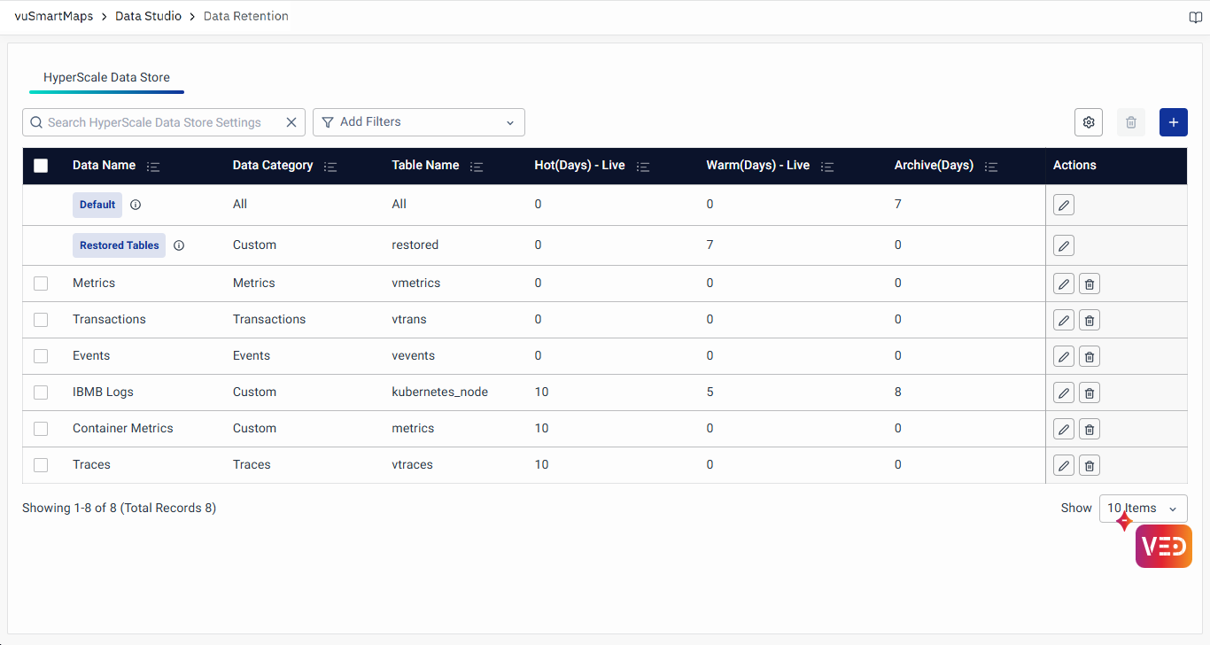 Upon accessing the Data Retention page, you will land on the default tab for HyperScale Data Store Retention Settings. The landing page lists, the following details for the configured data retention policies:
