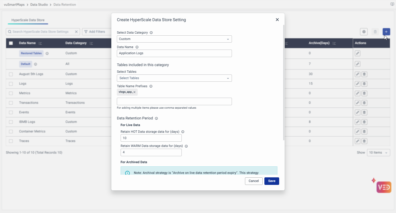 It is to be noted that initially, default retention periods will be set as 15, 5, and 10 days for the Hot, Warm, and Archived data storages.