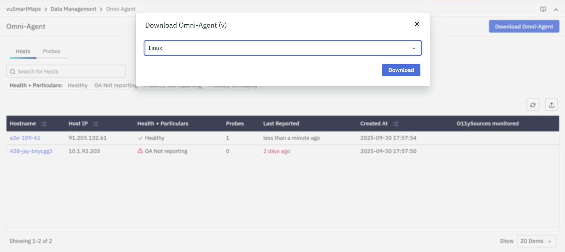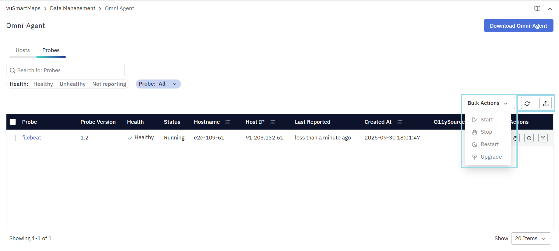 The OmniAgent Management Console provides a centralized interface within vuSmartMaps to manage and monitor all OmniAgent deployments across your environment. It allows administrators to view the health of hosts and probes, track reporting status, and perform key actions such as starting, stopping, restarting, or upgrading probes. With built-in filters, bulk operations, and direct download options for the OmniAgent package, the console enables easy oversight of probe activity and ensures all components are functioning correctly, and allows for quick resolution of any reporting or configuration issues.