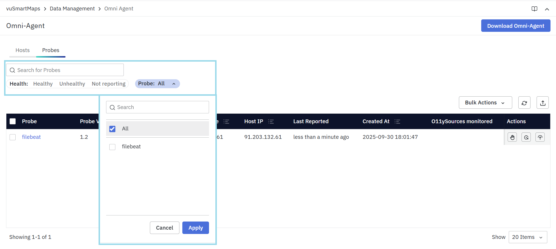 The Bulk Actions dropdown allows administrators to manage multiple probes at once, instead of performing actions individually. This is especially useful when the same task must be applied to multiple probes across different hosts.