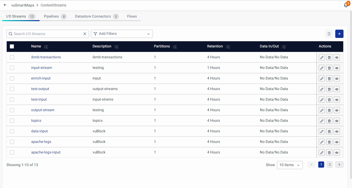 The user interface of the ContextStream section is composed of four primary tabs (I/O Streams, Data Pipeline, DataStore Connectors, Flows), each designed to facilitate specific actions and configurations, enhancing your ability to harness the full potential of ContextStream management.