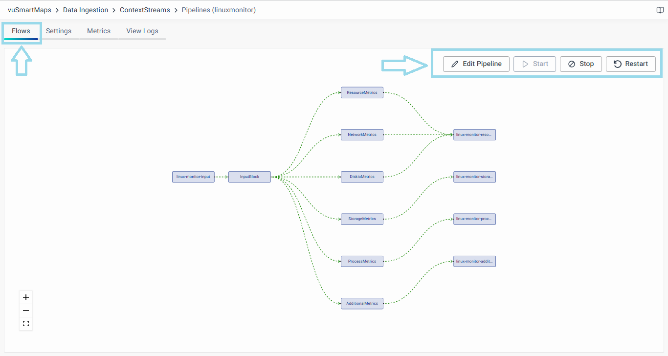 Under Flows, the pipeline flow chart is visible, providing a graphical representation of the data movement within the pipeline. If the pipeline is running, the flow chart includes subtle animations to indicate active data flow. If the pipeline is stopped, the connections are shown as solid lines, representing an idle state. This visualization helps users quickly understand the status of data movement within the pipeline.