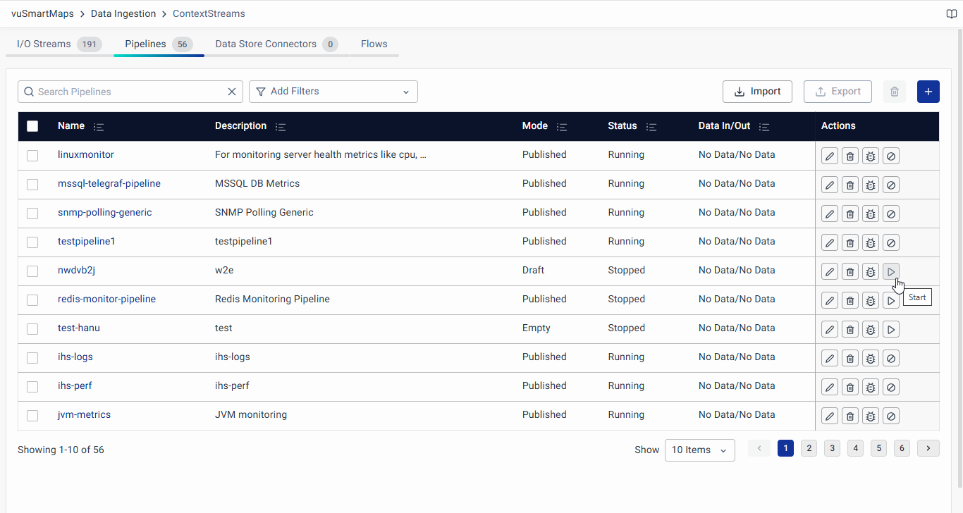 - Stop: Halts the data pipeline, pausing data ingestion and processing.