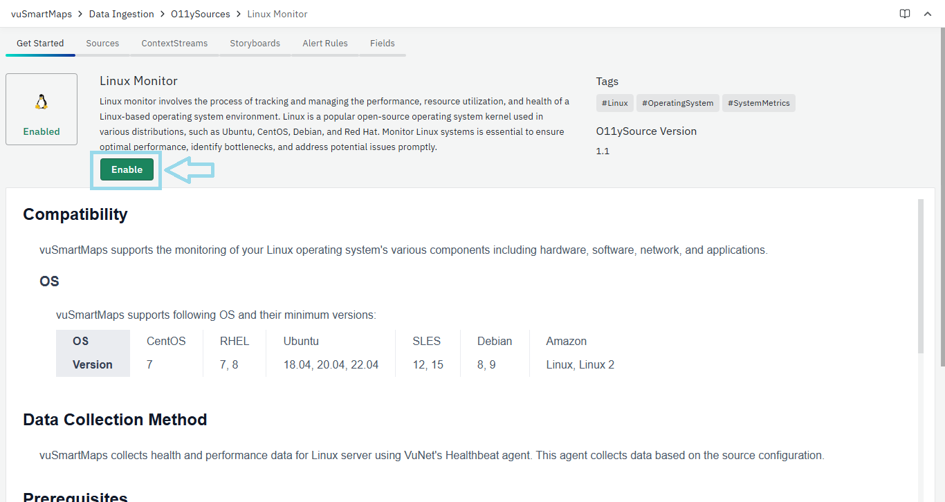 - Click the Enable button for the desired O11ySource. For example, we enable Linux Monitor as below: