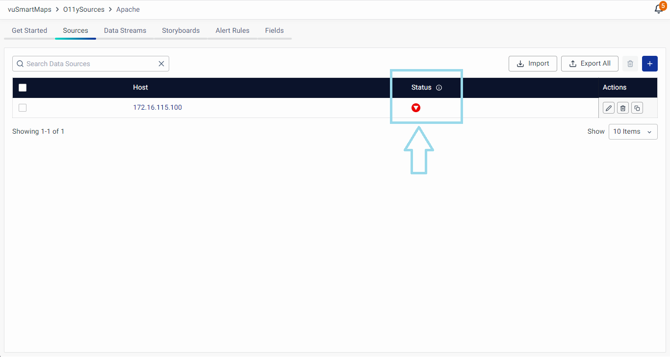 In the O11ySources Source tab, each host's data collection status for the last 15 minutes is vividly displayed in a dedicated column. Color-coded buttons provide a quick visual indicator.