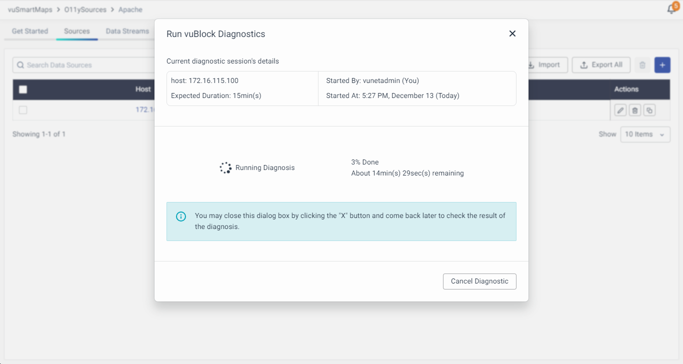 - Upon clicking the status icon, a modal window will appear. This modal window will provide access to commence diagnostics.