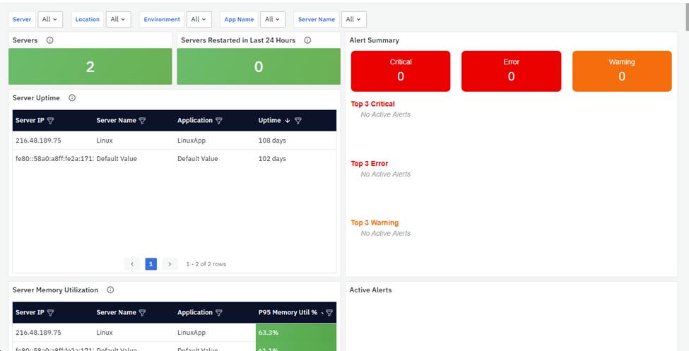 The dashboards can be accessed with the View button under the Actions column. An example of Linux Server Insights dashboard is shown below: