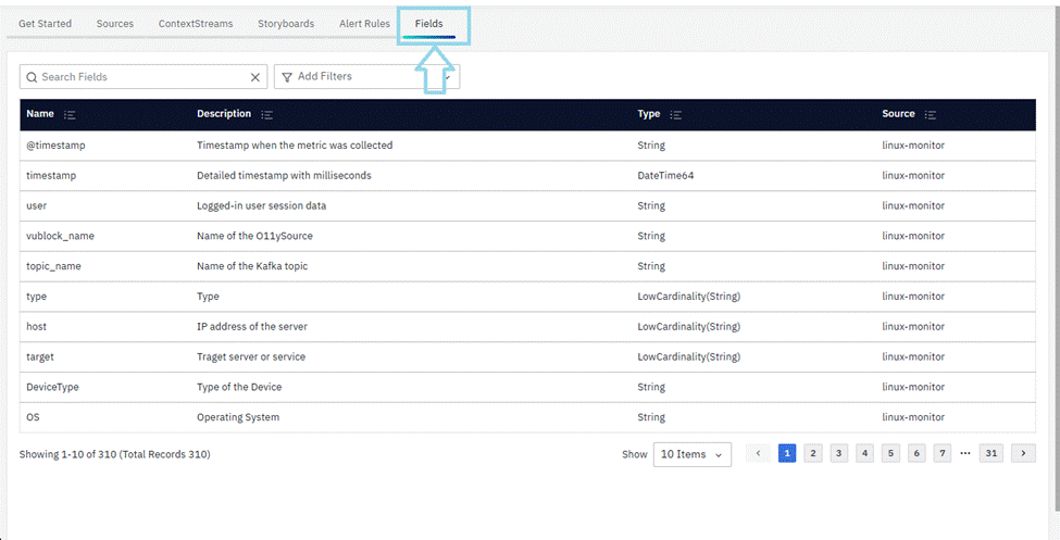 As data is ingested from configured Source Instances, the available fields correspond to the structure defined by the O11ySource.