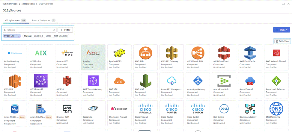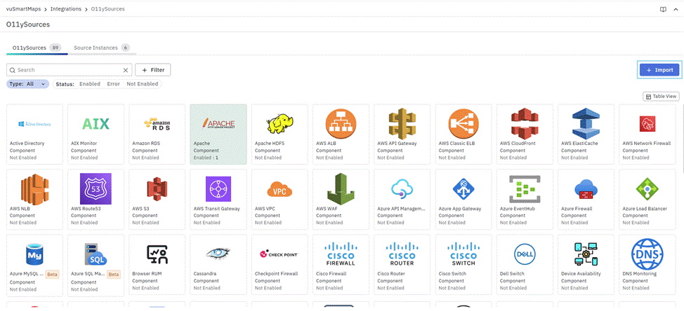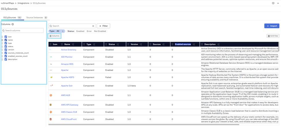 - O11ySources: Lists all supported integration types that define what kind of systems or technologies can be monitored in vuSmartMaps.