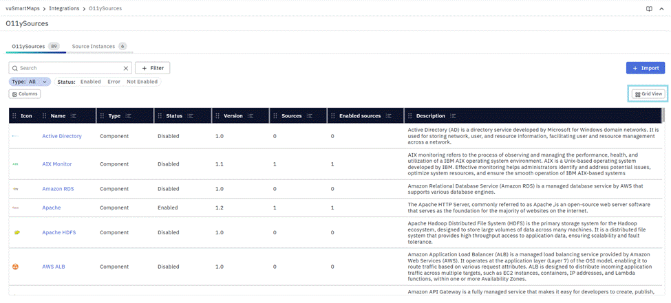 - By default, O11ySources are displayed in Grid View. You can switch to Table View to see a detailed, tabular representation.