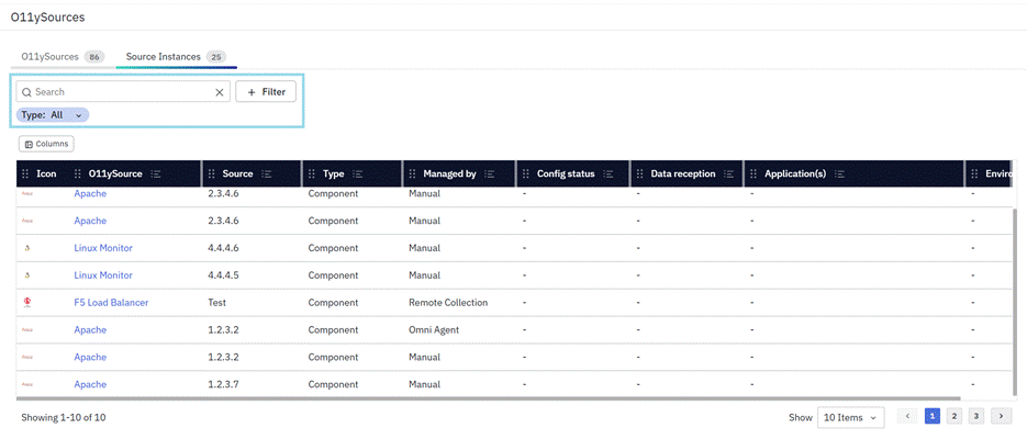 - For example, you can sort by O11ySource, Config Status, or Data Reception to quickly identify issues or active instances.