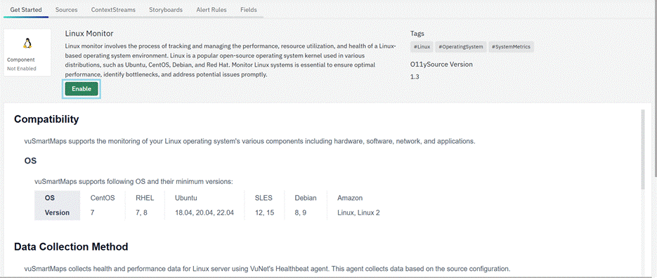 - Enabling an O11ySource only makes the integration available; data collection begins after Source Instances are configured.