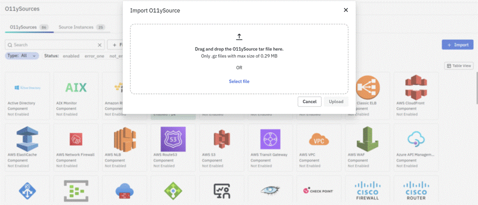 - Select the tar.gz file of the O11ySource you wish to import (maximum file size: 0.29 MB).