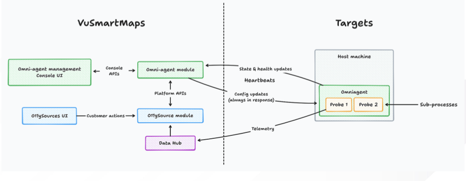 OmniAgent manages multiple data collection probes on a host system, ensuring that each probe gathers the required telemetry data as defined by the associated O11ySources. It continuously monitors the health of all probes and automatically performs recovery actions when issues arise. Within the overall vuSmartMaps architecture, OmniAgent interfaces with the vuSmartMaps Management Console through a secure control channel to provide centralized monitoring, update management, and seamless management of multiple hosts. Just like an air traffic controller coordinating multiple flights from different directions, OmniAgent ensures that every data source operates in sync, collecting, reporting, and recovering efficiently without disruption.