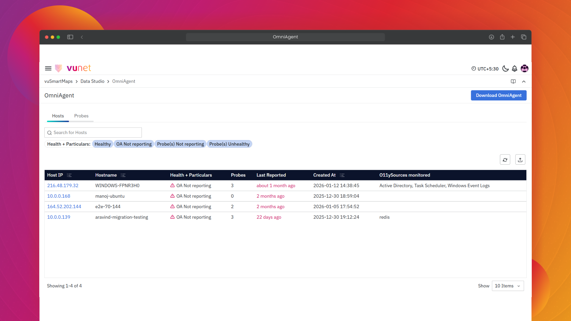 - OmniAgent Management Console: Displays host and probe health, reporting status, and lifecycle actions.