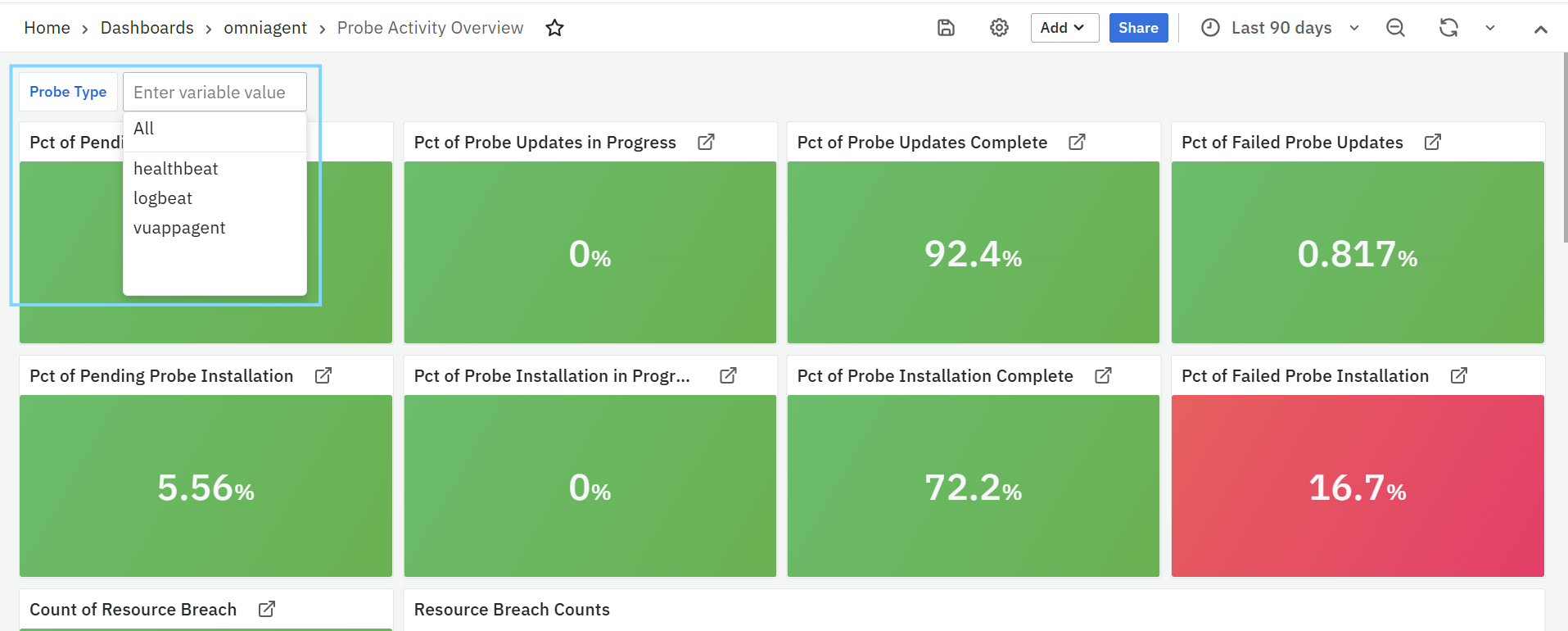 The Probe Activity Overview dashboard provides a consolidated view of the current status of OmniAgent probes. It helps users monitor probe installation progress, update status, and failures across the environment at a glance. This dashboard is mainly used to quickly assess probe health and identify areas that require attention. The Probe Type filter allows users to view probe activity metrics for a specific probe or for all probes together.