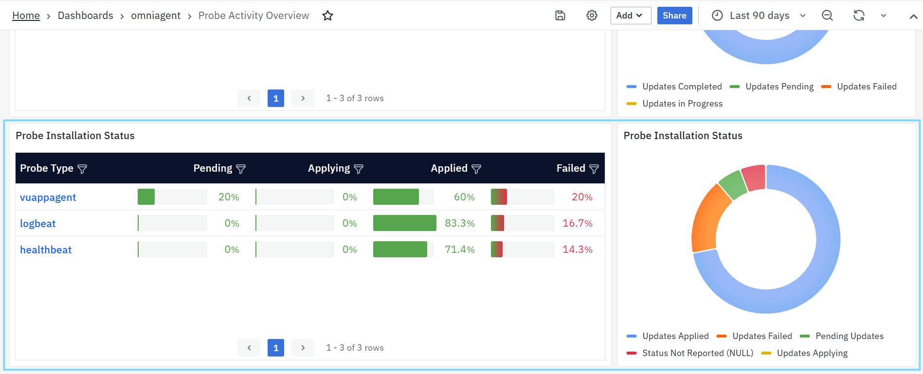 This pie chart provides a visual representation of the distribution of probe installation states, including pending, in progress, completed, and failed. It enables quick assessment of probe installation progress.