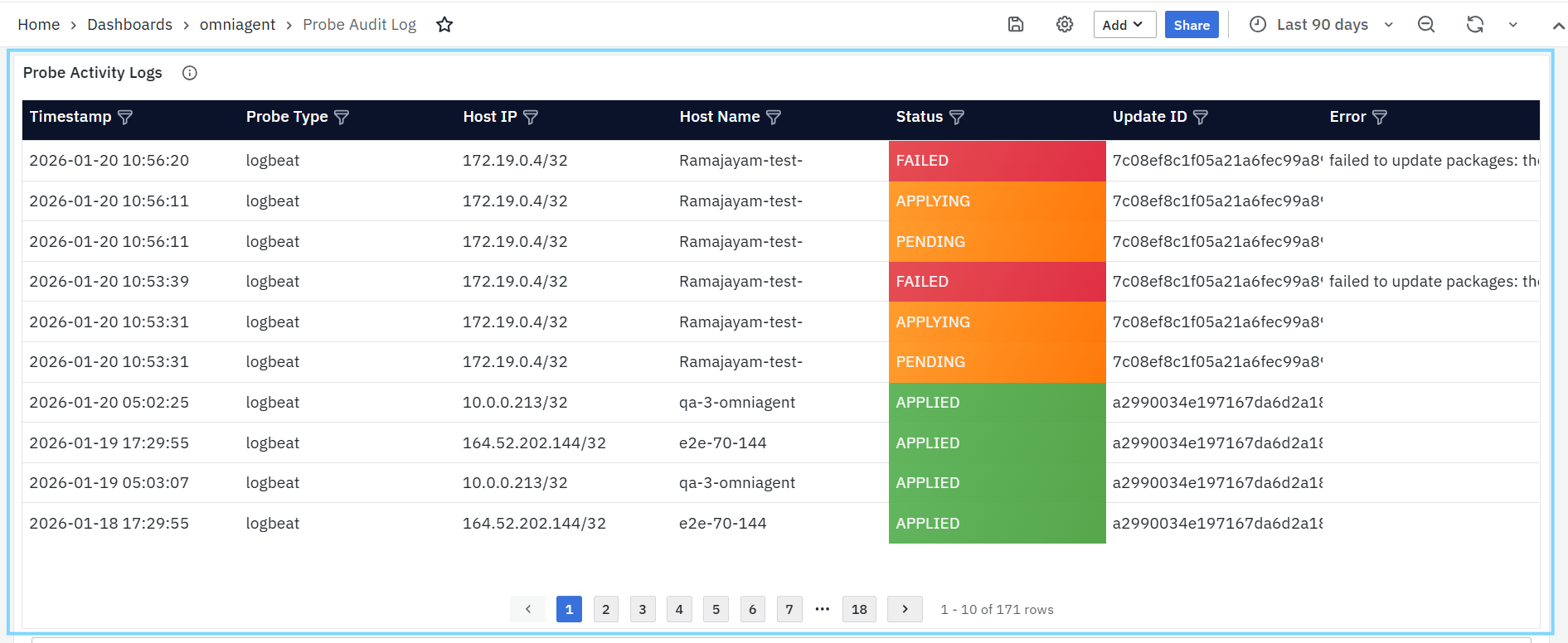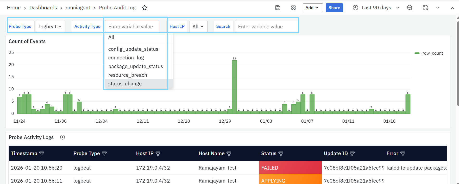 The Probe Audit Log dashboard provides a detailed view of probe-related activities captured over time. It is used to audit probe behavior, track update and configuration changes, monitor connection events, and investigate failures or resource-related issues. Use the following filters are available to narrow down audit log data: