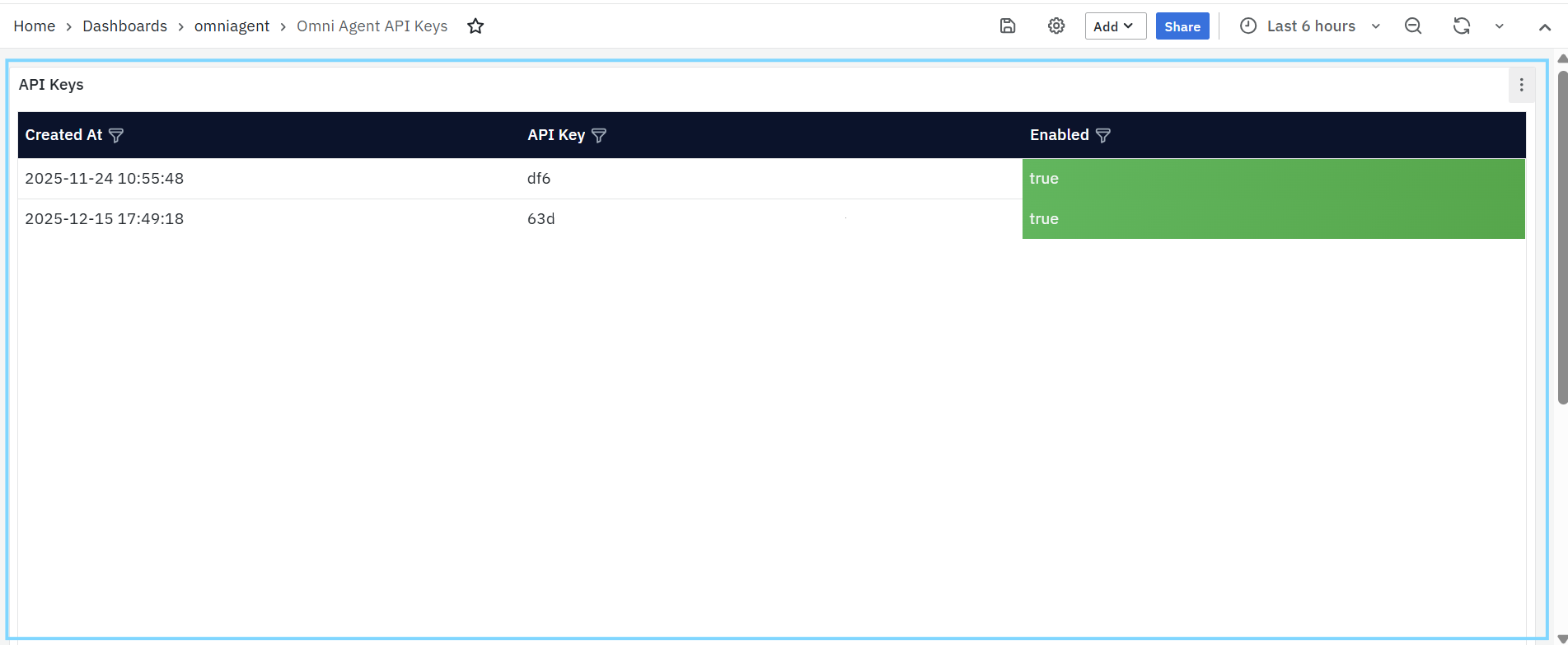 The OmniAgent API Keys dashboard provides visibility into the API keys used by OmniAgent for secure authentication and communication with the platform. This dashboard helps users track active API keys and verify their status.