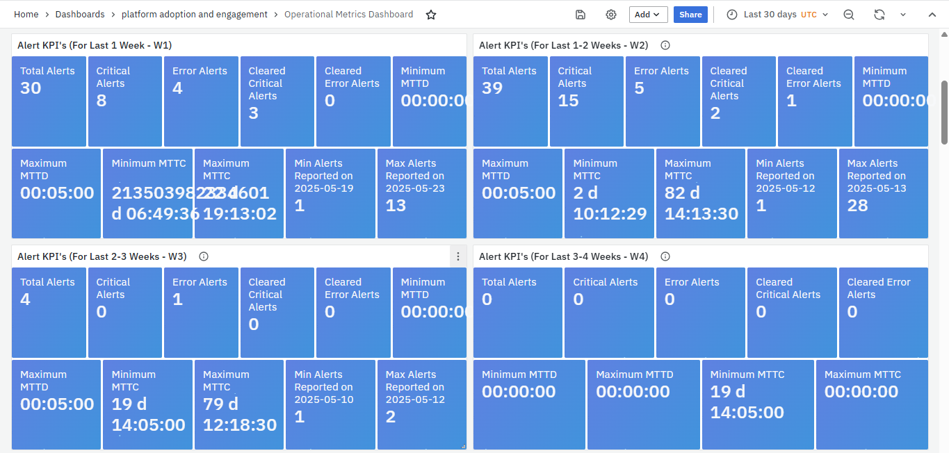 These week-wise panels (W1 to W4) help identify trends, compare alert loads across weeks, and evaluate responsiveness in detecting and clearing issues.