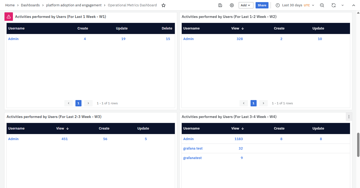 Tracking these metrics week-by-week helps identify key users, their dashboard preferences, and usage trends, providing insights into platform engagement and operational focus areas.