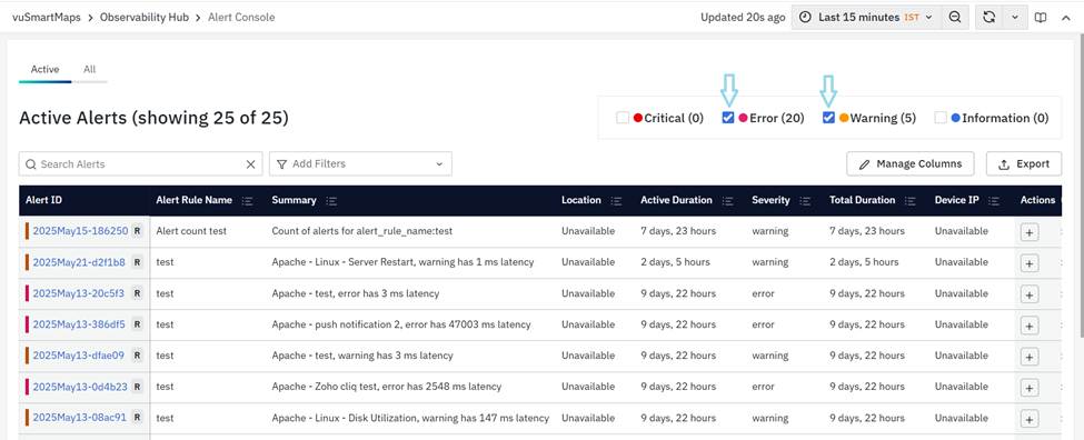 You can apply multiple filters in the Alert Console by clicking on multiple widgets. For example, to view both Error and Warning Alerts, click on both Error and Warning widgets, and the page will filter accordingly.