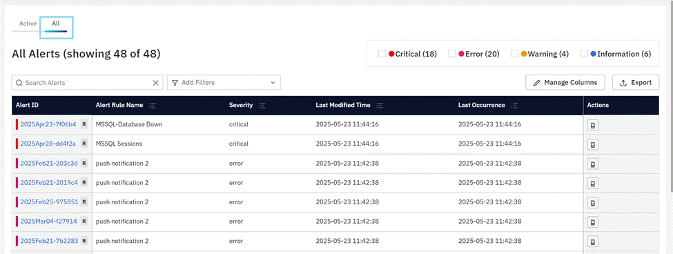 This tab lists the detailed view of ‘Active Alerts’ and ‘All Alerts’ triggered during the specified period.