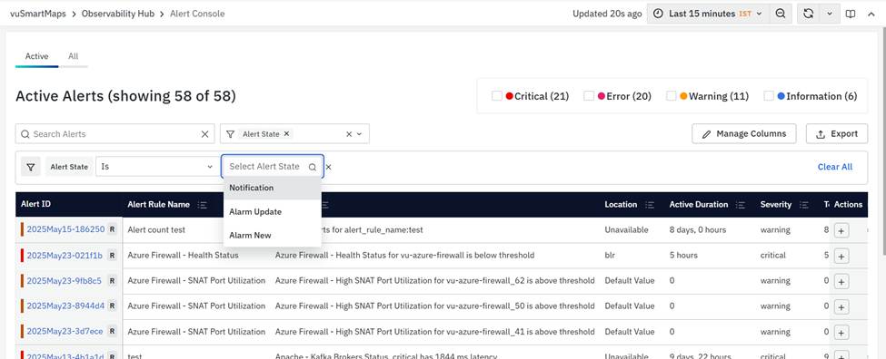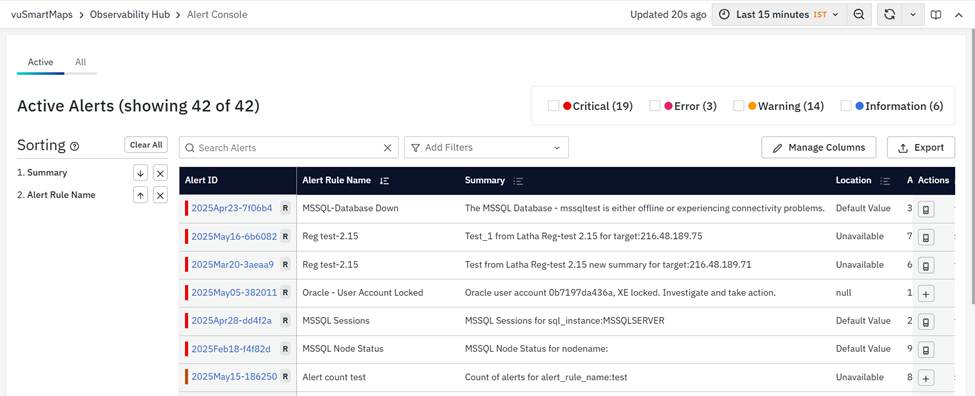 vuSmartMaps Alert Console can be accessed by navigating from the left navigation menu (Observability Hub > Alert Console).