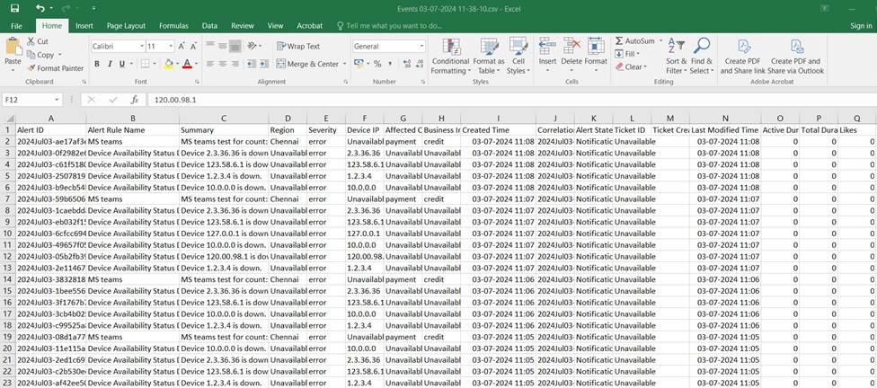 Click the Export button in the Alert Listing table to download a CSV file of the alerts. The exported file will include all displayed columns.