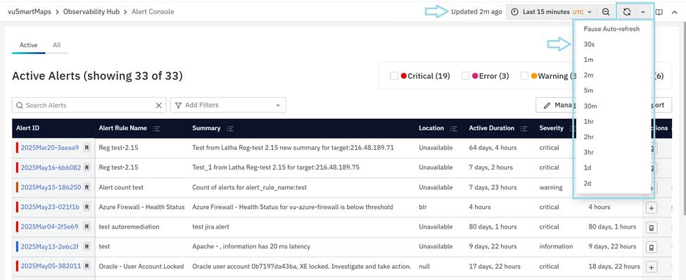 - The dropdown menu provides various time intervals (e.g., 30 seconds, 1 minute, 2 minutes, etc.) for auto-refreshing the alert list. You can select any of these intervals based on how frequently you want the data to update.