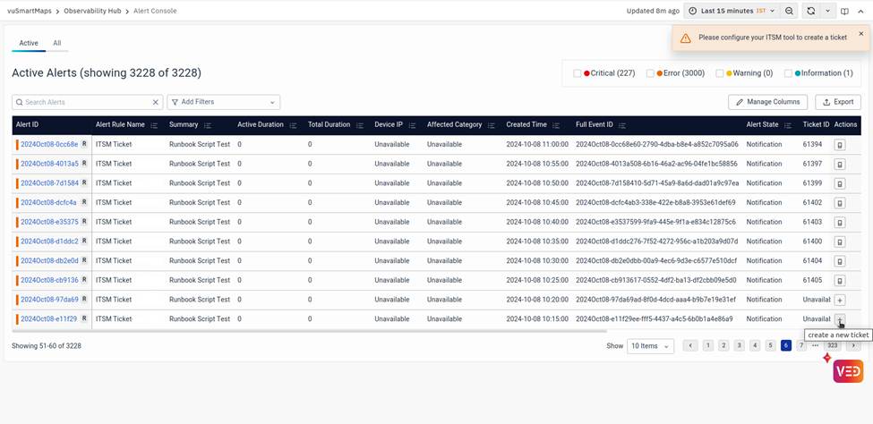 - Actions: The tickets can be managed by creating a new one or viewing an existing one. For more details, refer to Managing Alert Page Tickets.
