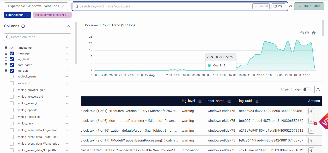 The Regex filter in Vunet Query Language (VQL) enables advanced pattern matching and text extraction within your data. Unlike standard filters that search for exact values or simple conditions, the Regex filter allows you to define complex patterns to capture a wide variety of entries, even those that do not conform to a simple string or exact match.