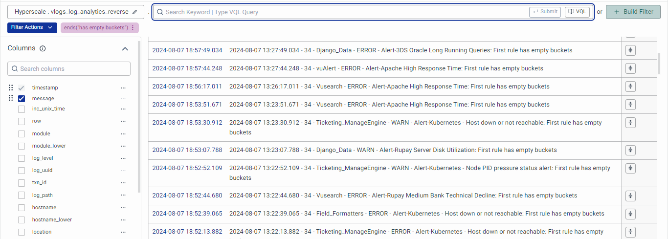 For example, to search for "Error in VuBlock" in the message field, use the following: