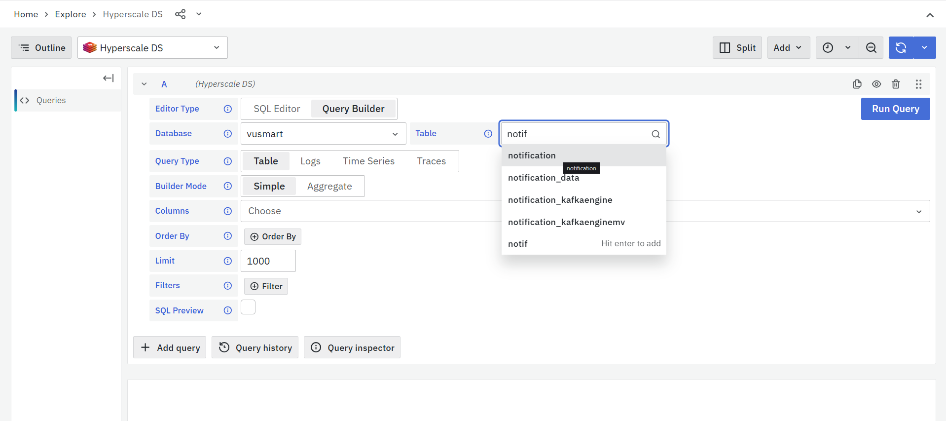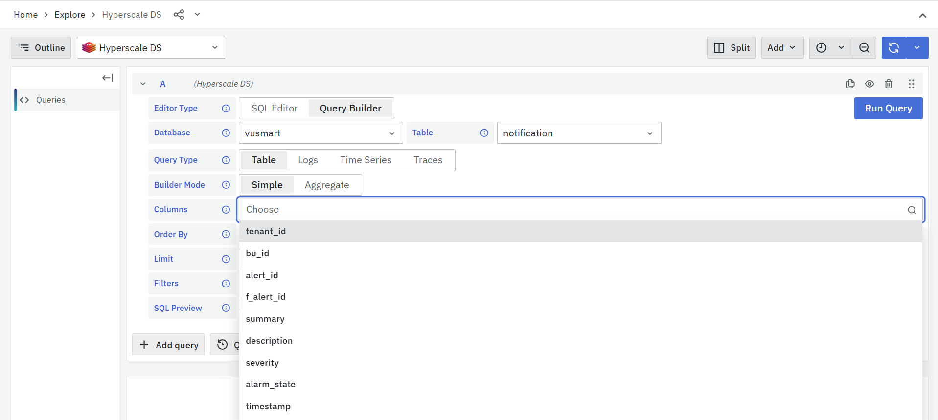 In the Explore panel, start by setting the Editor Type to Query Builder. Then, under the Table dropdown, choose the notification index that corresponds to the alert you want to retrieve.