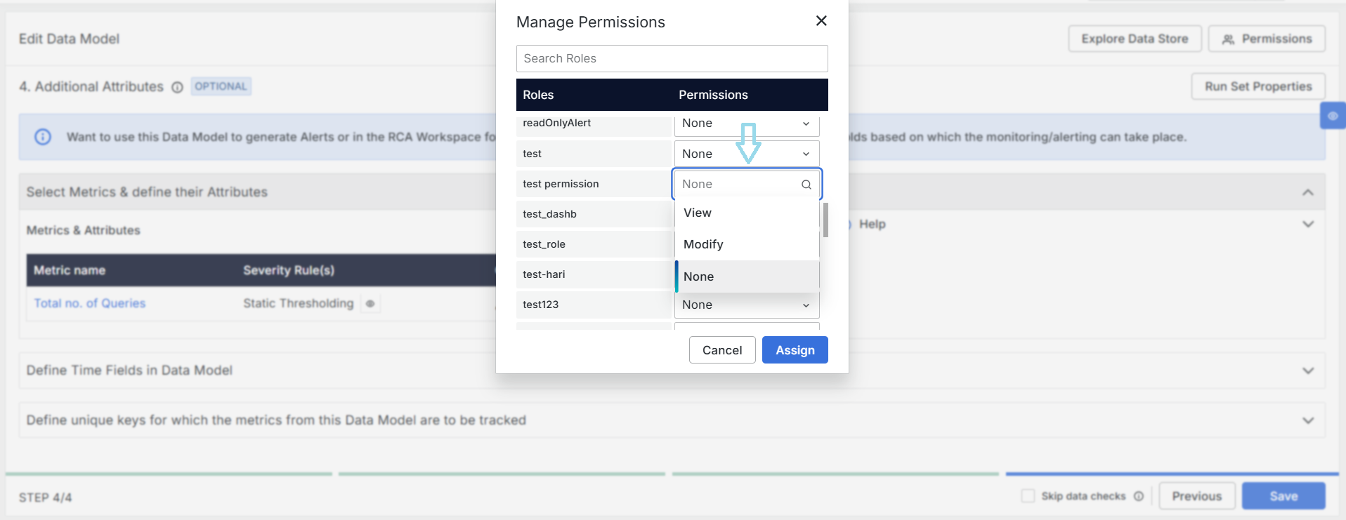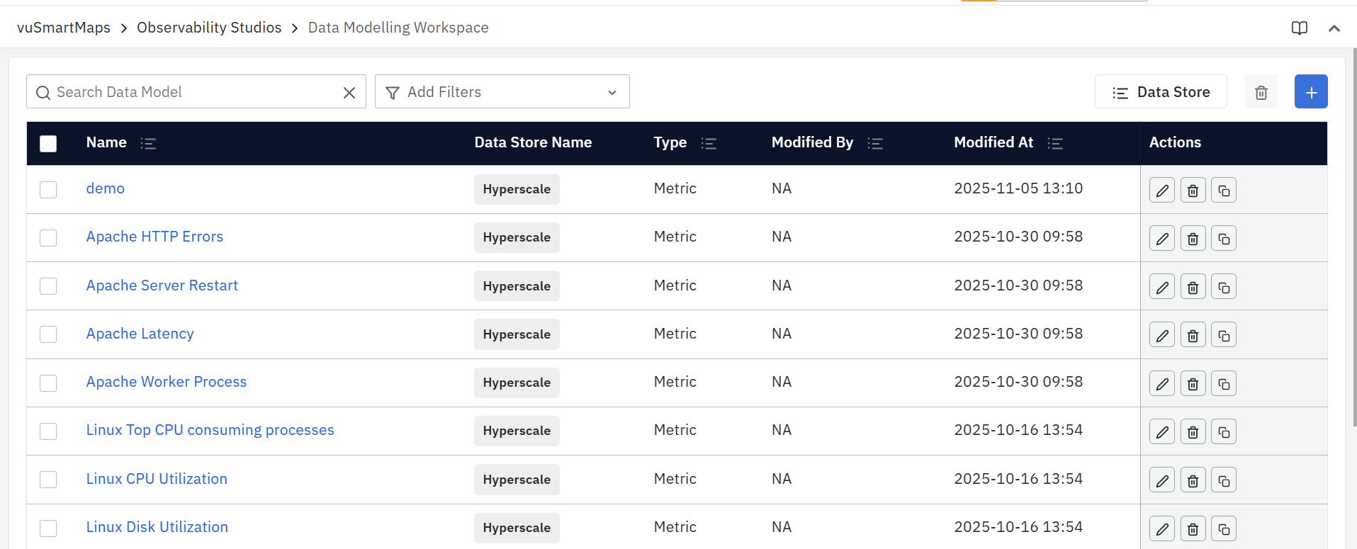 - Accessing Data Modelling Workspace: Navigating your Data Modelling Workspace is a breeze. vuSmartMaps Data Modelling can be accessed from the left navigation menu by clicking Data Modelling Workspace under Configure Observability. Once you're there, you'll find a list of all the data models. You can easily manage your Data Models by performing actions such as creating, viewing, editing, and deleting them. For enhanced control, you can customize permissions for different roles—whether it's granting viewing rights or permitting modifications.