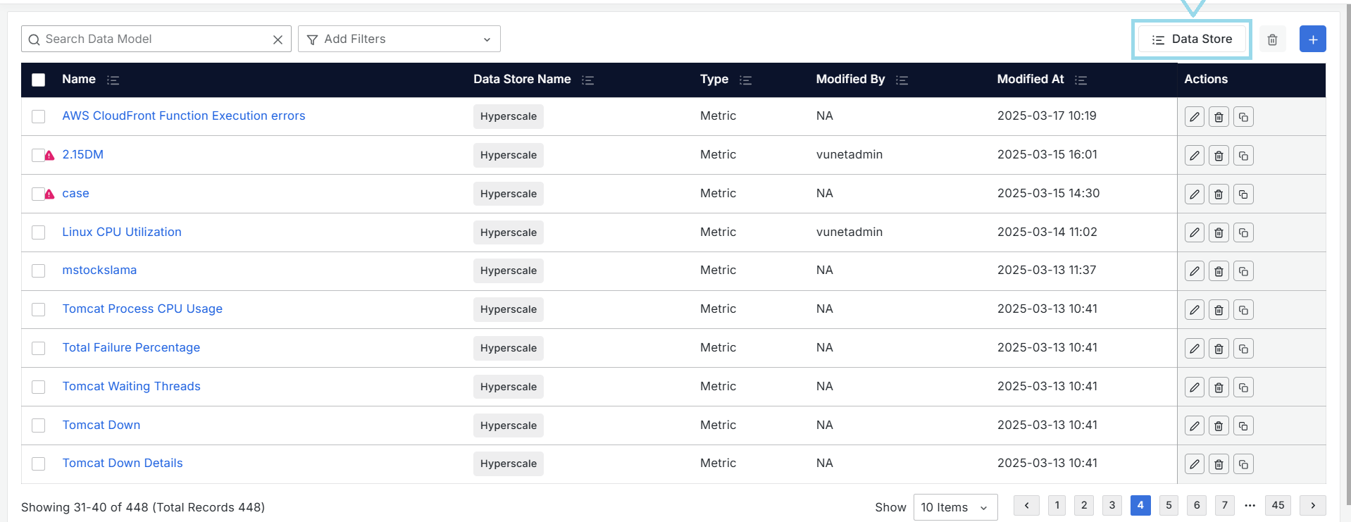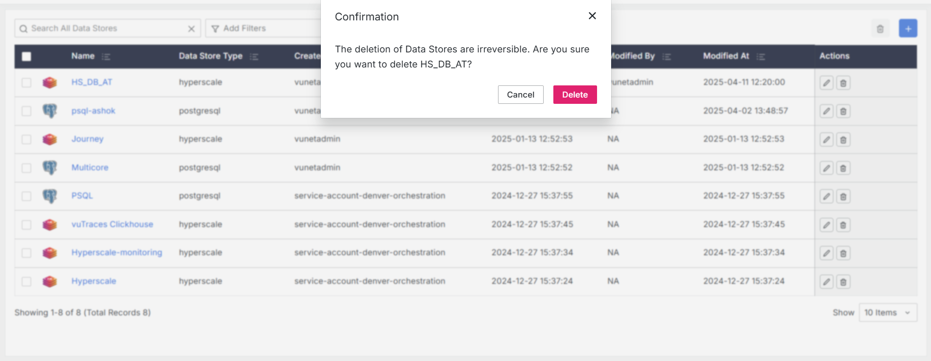 - Click the Delete button under the “Actions" column for the specific Data Store you want to delete.