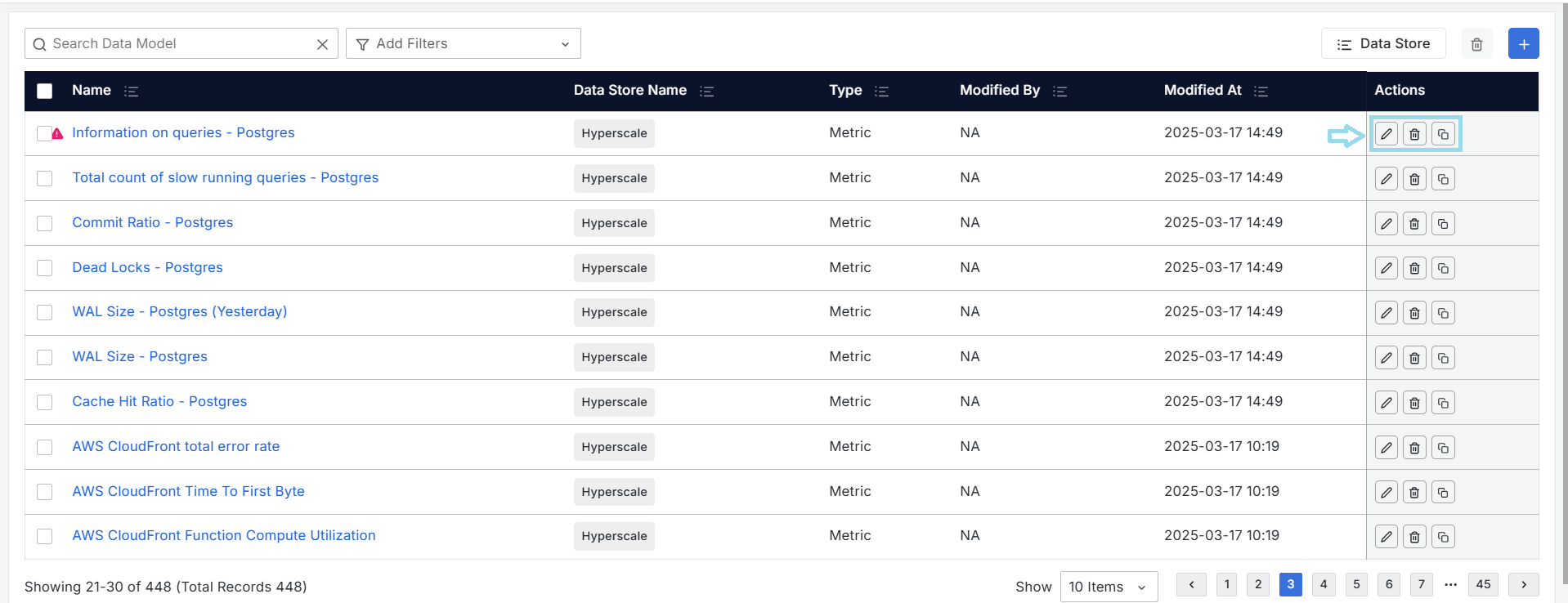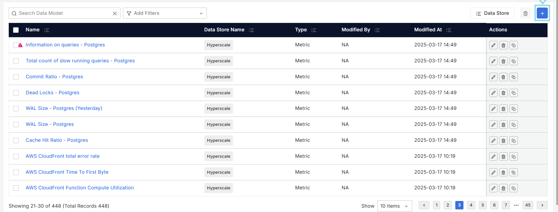 All the Data Models created in the system are visible here. Utilize features in the listing table, such as search and filters, to locate specific Data Models.
