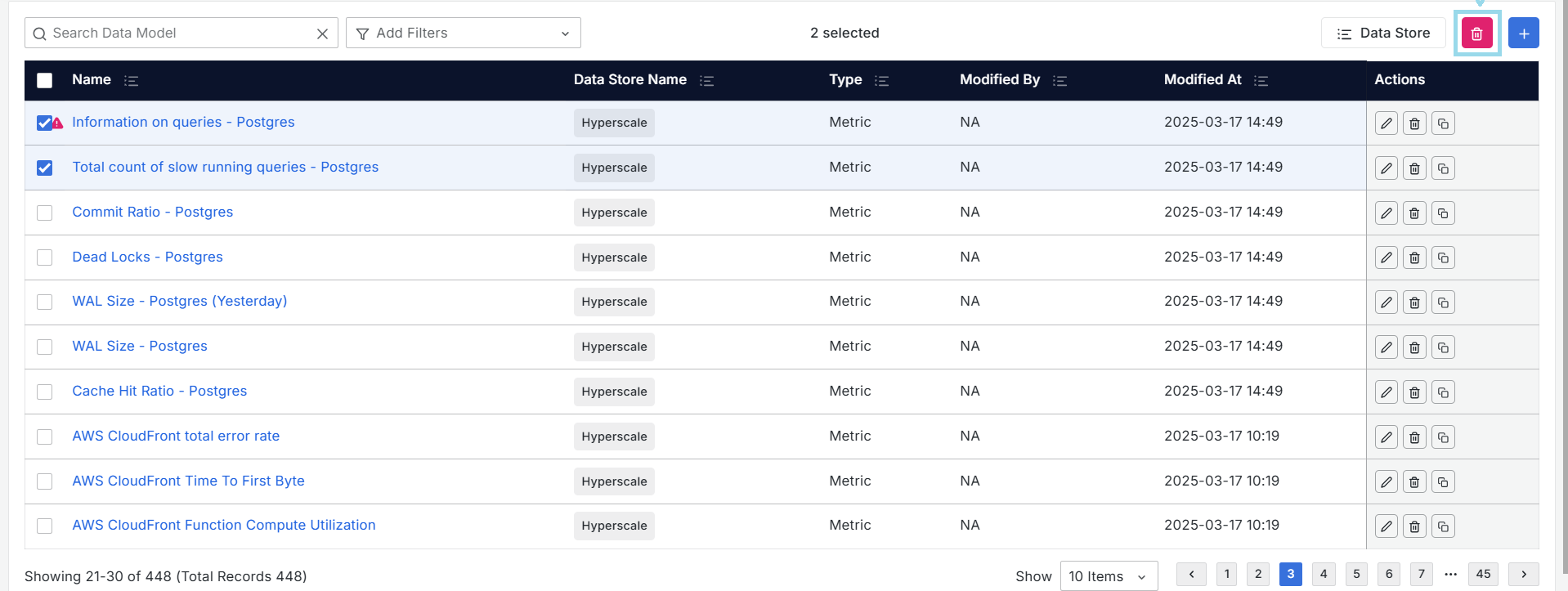 Deleting Multiple Data Models: Select the multiple Data Models by checking the boxes on the extreme left and clicking the Delete button on the top right.