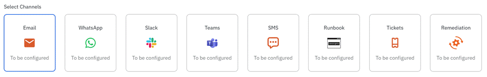 Step 8: ‘Select Channels’ allows you to manage how notifications are delivered. You can use email, WhatsApp, SMS, Runbook Automation, Slack, and MS Teams for communication. Configure recipients, groups, and message content to tailor alert content to your needs. This is similar to channel configuration in the Alerts.