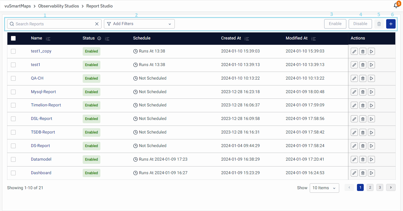 The Report Studio module within vuSmartMaps™ offers comprehensive capabilities for administrators to create and manage various reports, including long-term data storage reports. Users can conveniently access and manipulate report details such as name, status, schedule, and creation/modification time, and perform actions like editing, deleting, or generating reports directly from this interface.