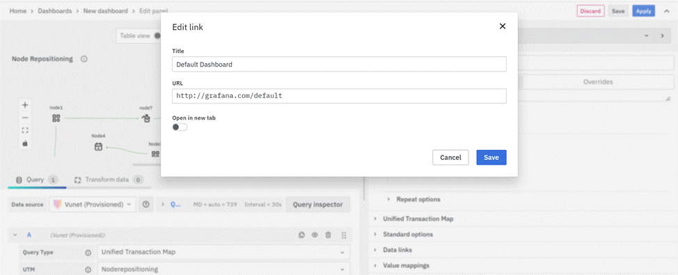 - Panel Link: Create a link to another website or dashboard. Provide a title, and URL, and choose to open it in a new tab if needed. Click Save.