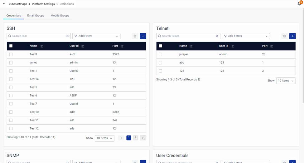 The Definitions module plays a pivotal role in vuSmartMaps by allowing users to configure credentials and communication groups. Its importance lies in ensuring secure access control and efficient communication within the platform. Users can establish various credentials like SSH, Telnet, SNMP, User, and Cloud Provider, simplifying authentication processes. Additionally, Definitions facilitates the creation and management of Email groups and Mobile groups, making it convenient to organize users for notifications, alerts, reports, or other forms of communication.