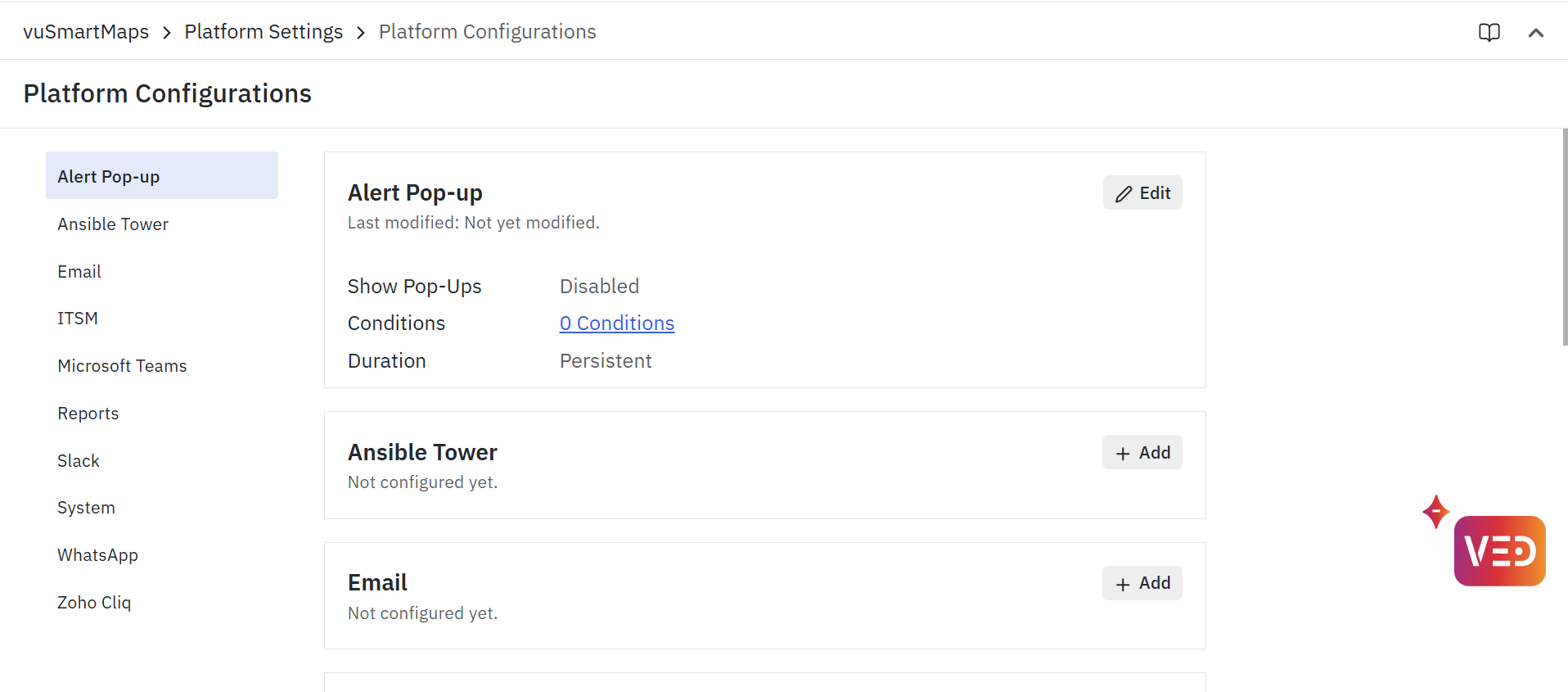 The Platform Configurations module in vuSmartMaps serves as a centralized hub for configuring system-level settings, enabling administrators to tailor the platform's behavior and integration capabilities. This functionality allows organizations to align vuSmartMaps with their specific operational needs, optimizing performance, enhancing automation, streamlining communication, and improving data management. Users can configure key parameters such as email notifications, IT Service Management (ITSM) integrations for automated ticketing, date and time formats for Reports, and connections to widely used communication platforms. This flexibility ensures that workflows are tailored to meet operational demands while improving overall system responsiveness and efficiency.